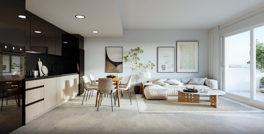 Las viviendas destacan por sus amplios ventanales que llenan de luz natural cada espacio y se prolongan hacia terrazas privadas, concebidas como auténticos refugios de descanso. Desde ellas, podrás elegir entre las vistas infinitas al mar Mediterráneo o la imponente silueta de la sierra de Mijas, haciendo de cada amanecer y atardecer un espectáculo diario.